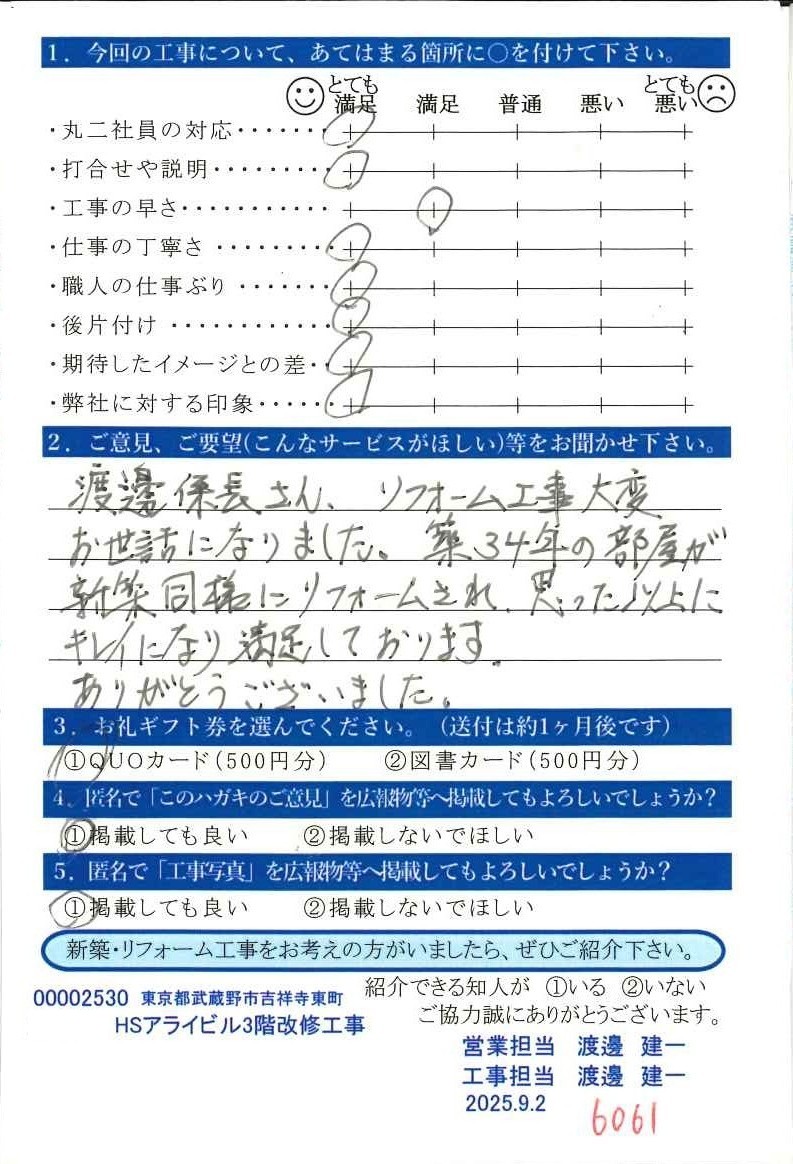 渡邊係長さんリフォーム工事大変お世話になりました。築34年の部屋が新築同様にリフォームされ思った以上にキレイになり満足しております。ありがとうございました。