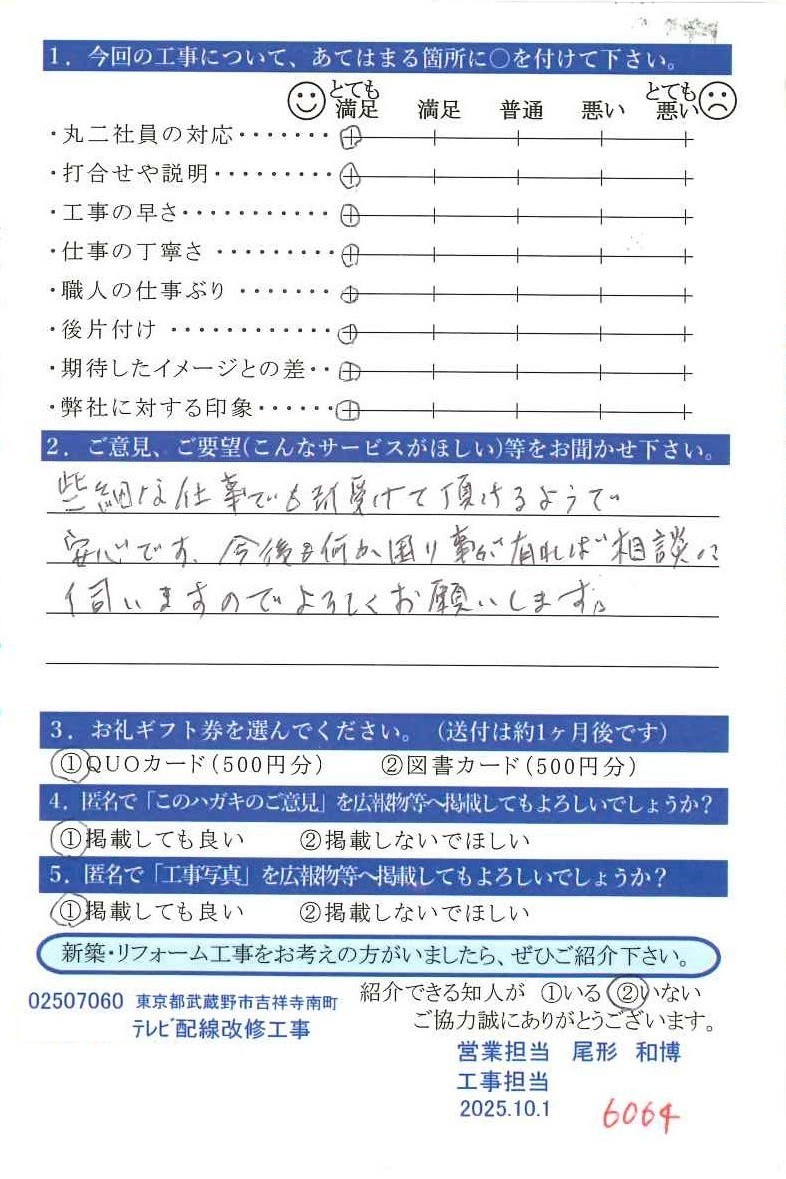 些細な仕事でも引受けて頂けるようで安心です。今後も何か困り事が有れば相談に伺いますのでよろしくお願いします。