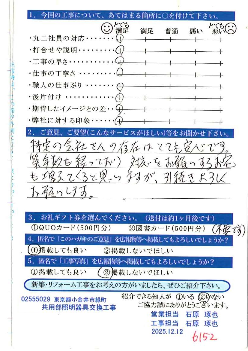 特定の会社さんの存在はとても安心です。築年数も経っており対応をお願いするお宅も増えてくると思いますが引き続きよろしくお願いします。